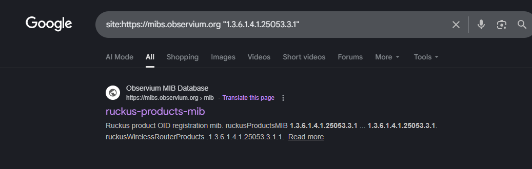 search online repository for mib with OID “1.3.6.1.4.1.25053.3.1” to find relavent mib file. Could use the following filter to search from specific repository.
