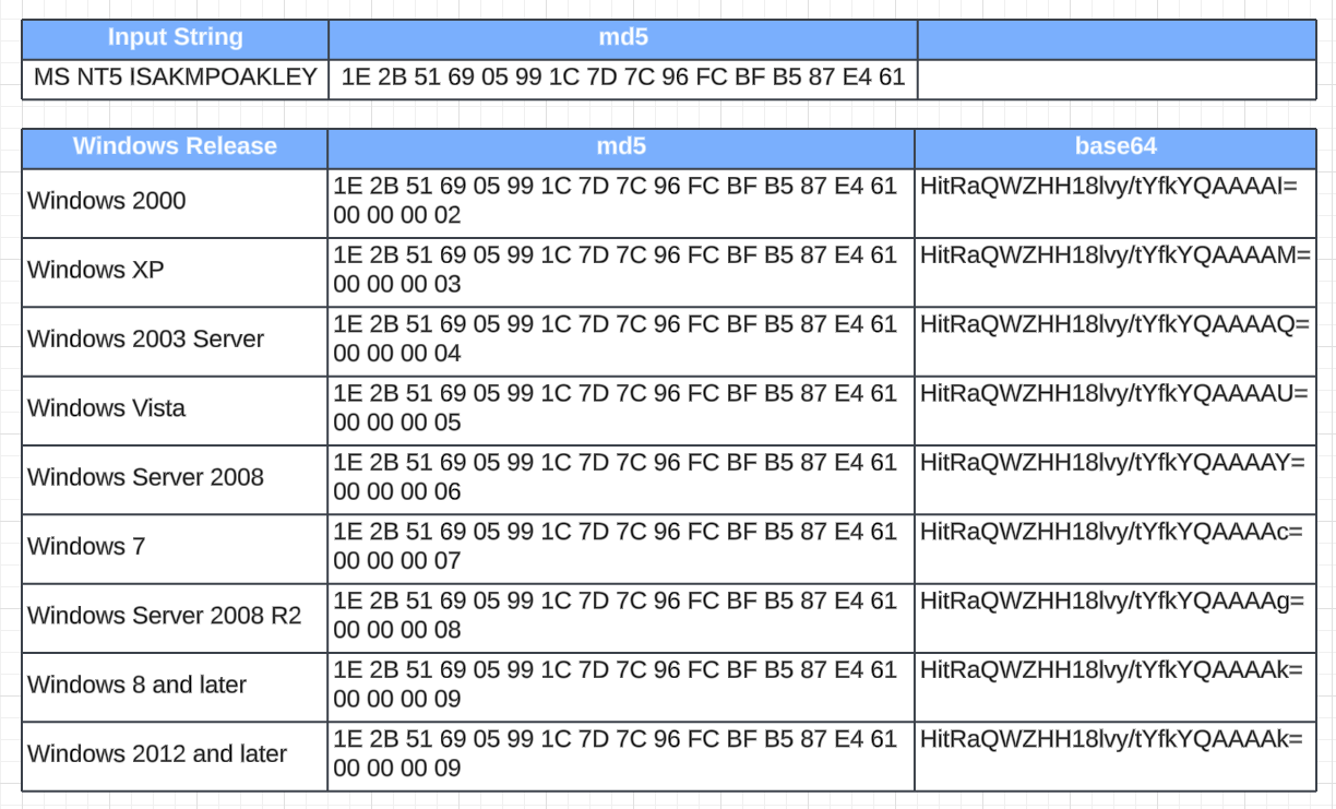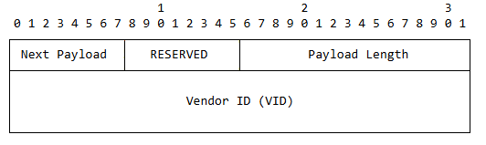 The Microsoft implementation vendor ID is constructed by appending a 4-byte version number in network byte order to the 16-byte MD5 hash of the “MS NT5 ISAKMPOAKLEY” string. The version number is the additional 4 bytes that denote the Windows release. reference
