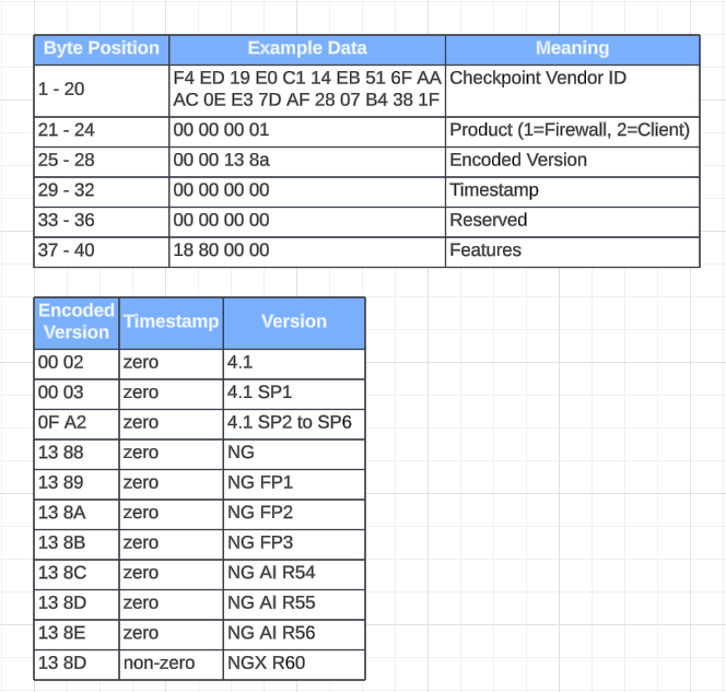 This CheckPoint VID is 40 bytes in length. The first 20 bytes are always the same, and the last 20 bytes contain details about the version and configuration. The 2nd 20 bytes (bytes 21 to 40) of the Vendor ID payload consist of five 4-byte integers in network (big endian) byte order. The 4-byte integer at byte positions 25 to 28 inclusive contains the Firewall-1 version number. reference